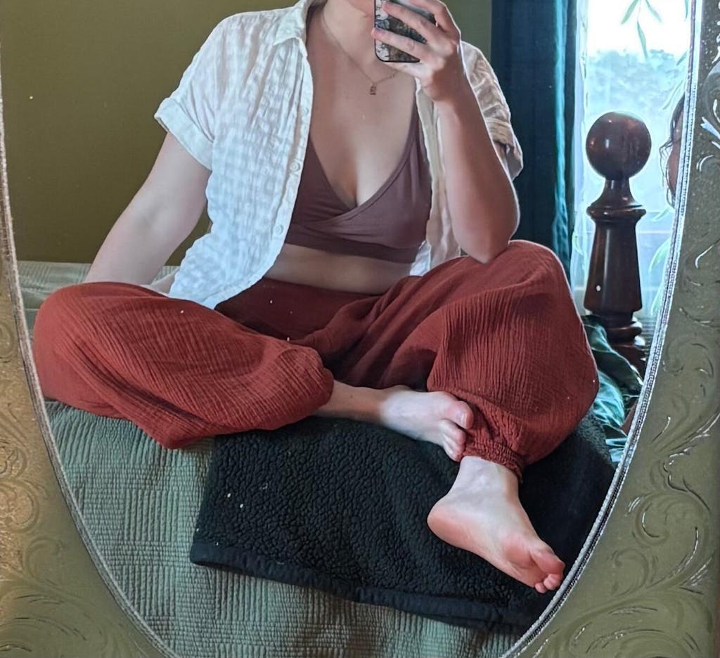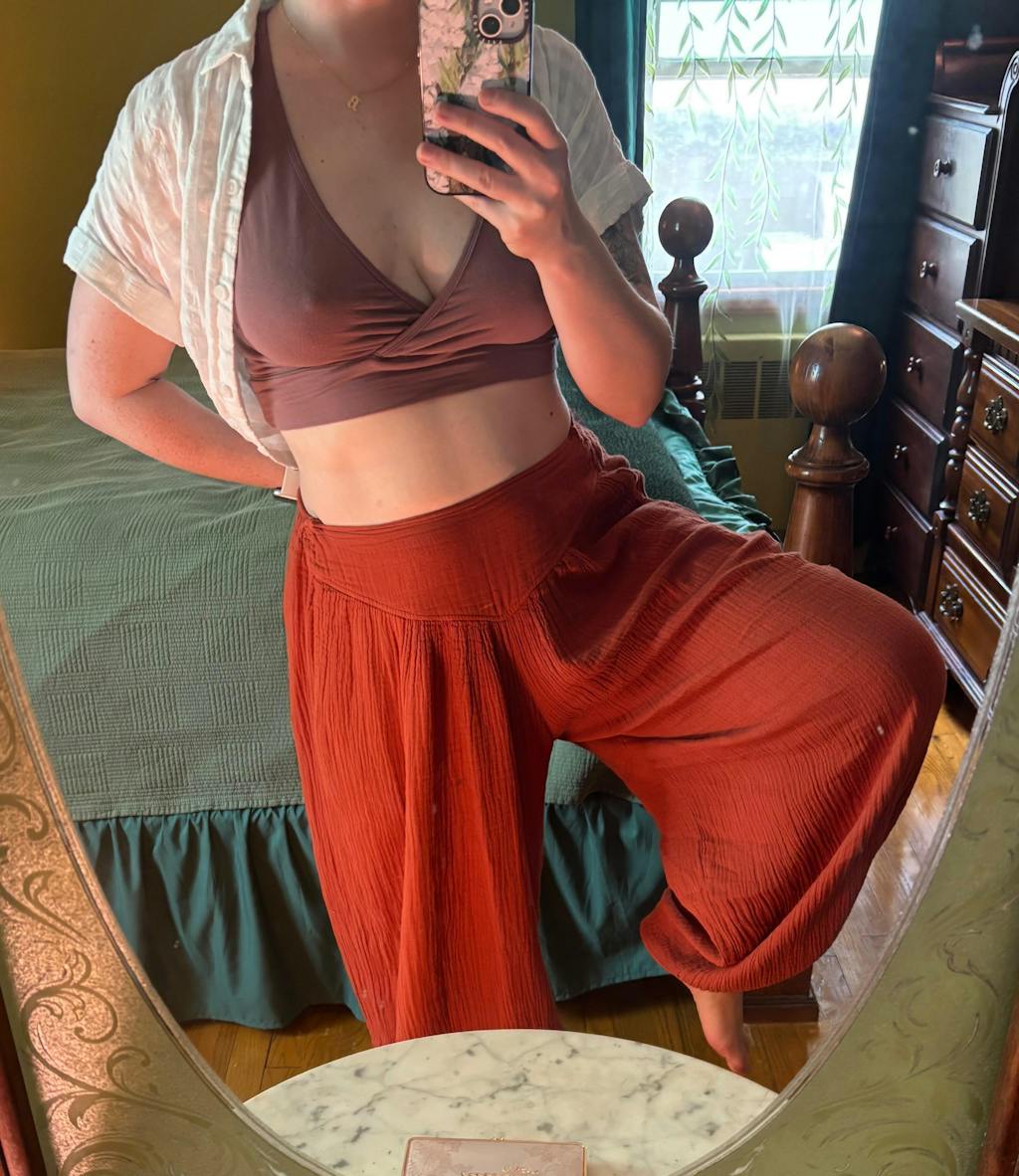 These pants are amazing the gauze style and the way they stay tighter around ur ankle and u can do yoga in them! Plus the V shape by ur tummy is amazing. Love the way that style helps my tummy look flat. Also in love with this color... will def be ordering more